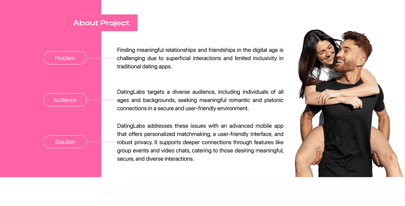 DatingLabs addresses these issues with an advanced mobile app that offers personalized matchmaking, a user-friendly interface, and robust privacy. It supports deeper connections through features like group events and video chats, catering to those desiring meaningful, secure, and diverse interactions.