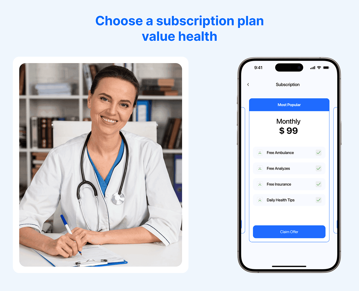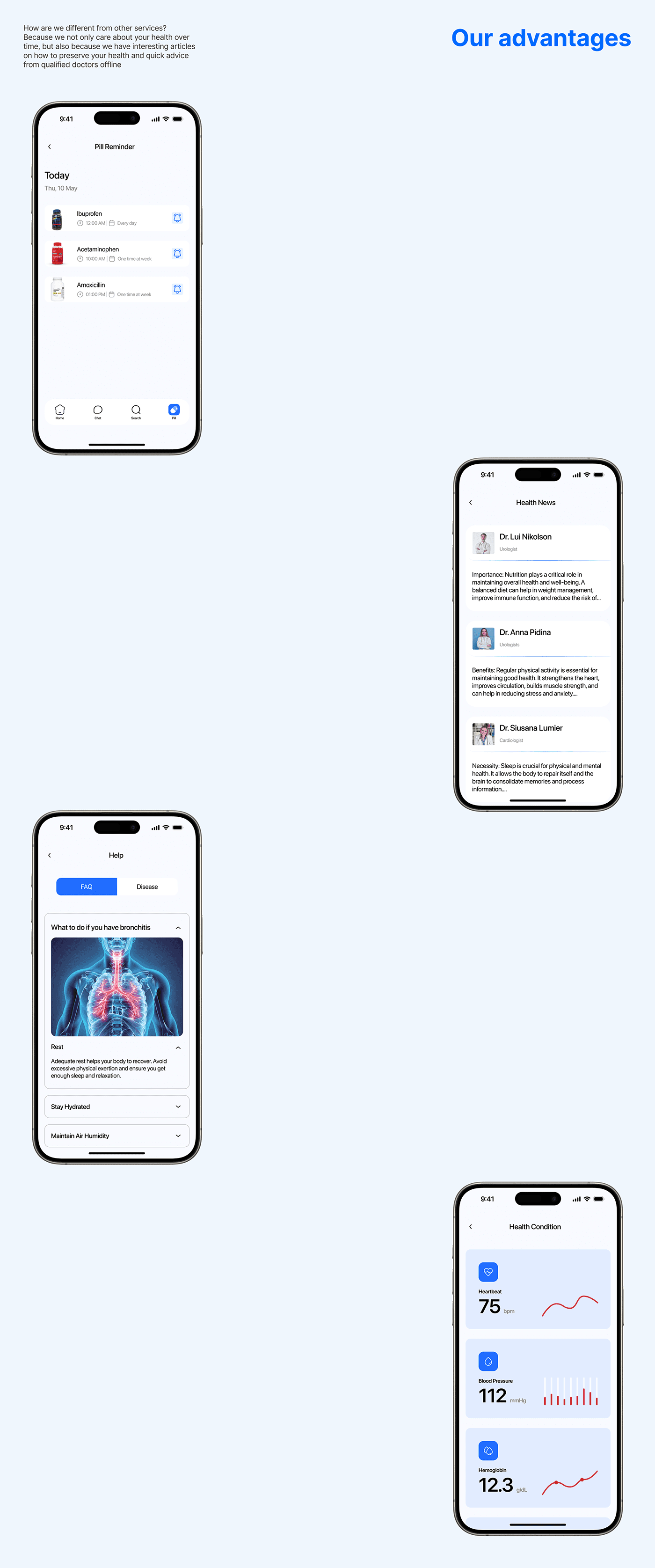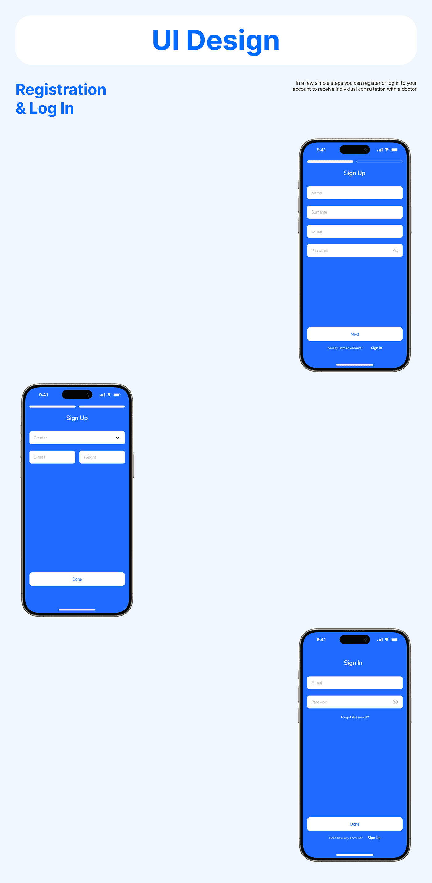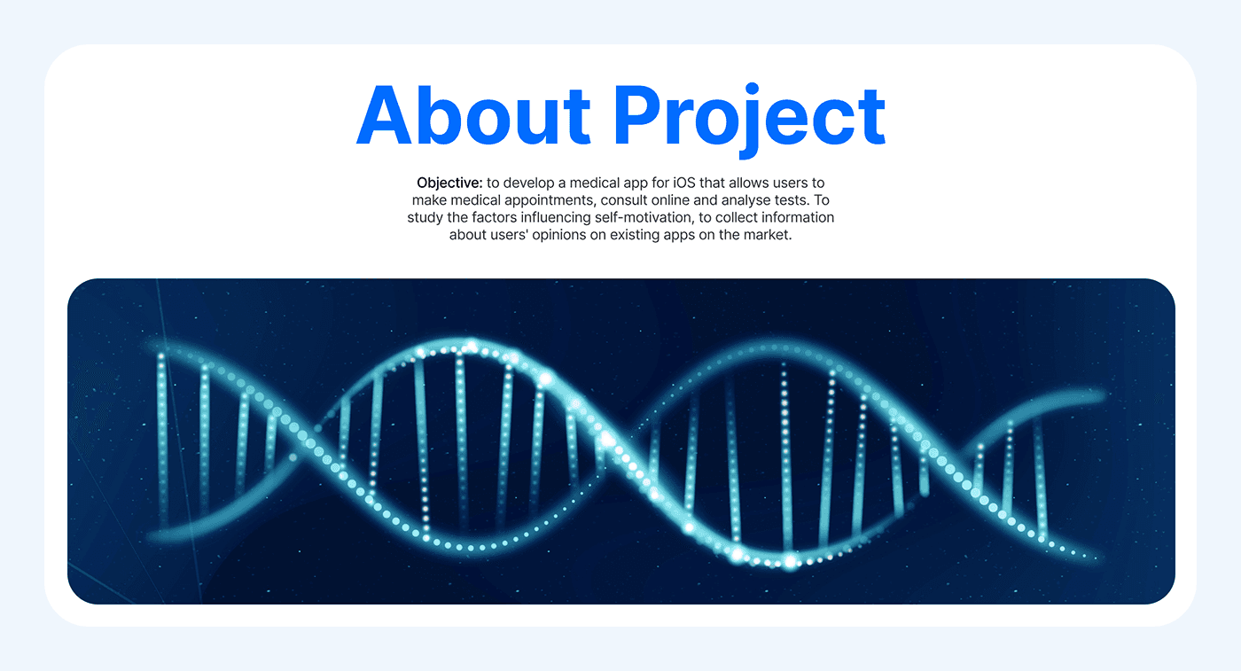 Objective: to develop a medical app for iOS that allows users to make medical appointments, consult online and analyse tests. To study the factors influencing self-motivation, to collect information about users' opinions on existing apps on the market.